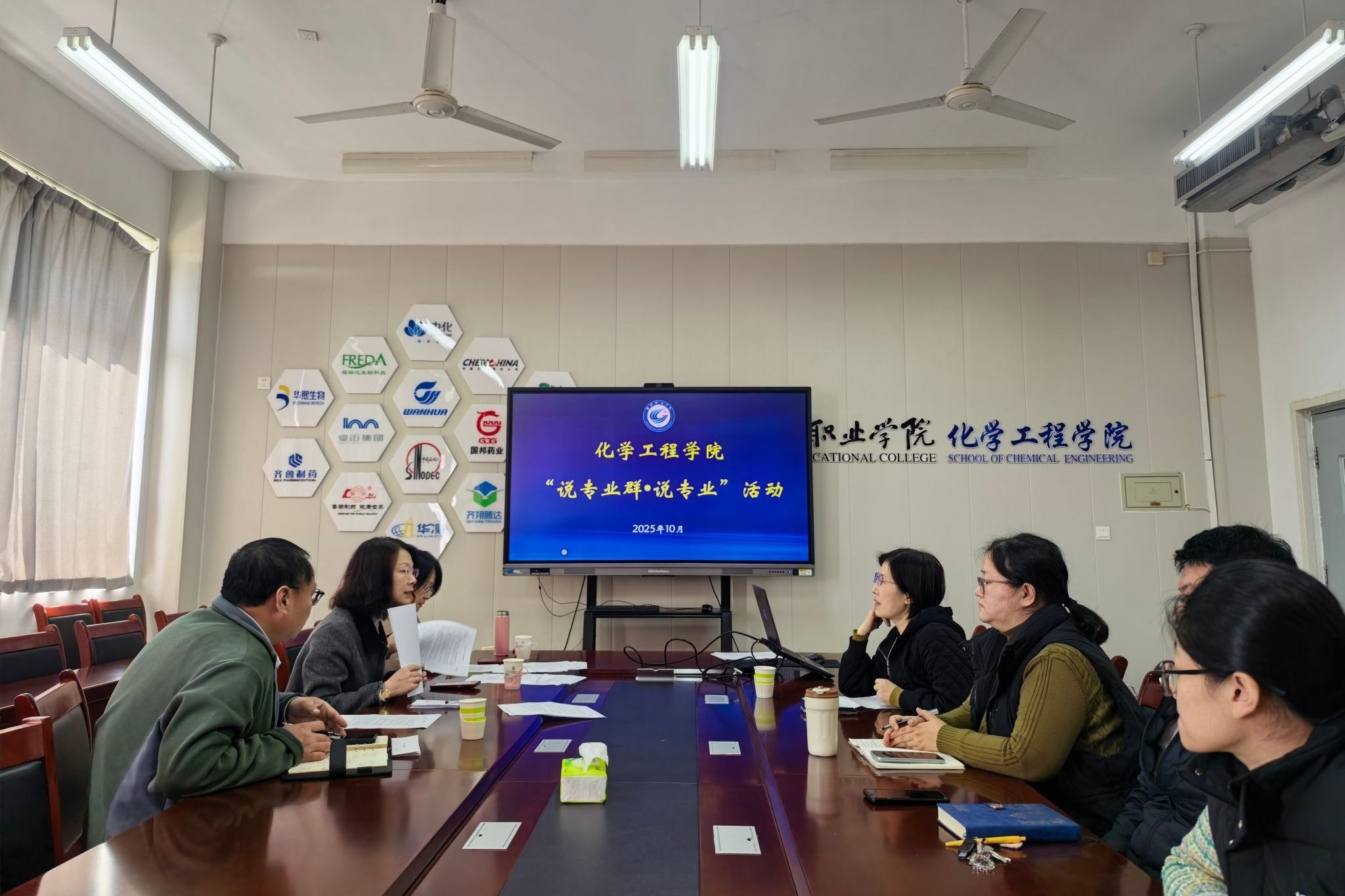 活动伊始,化学工程学院教学副院长率先登台,围绕山东省高水平专业群——应用化工技术专业群建设展开系统汇报。她结合区域化工产业转型升级及绿色化工发展需求,详细阐述了专业群定位、组群逻辑、建设思路与目标等专业群建设核心维度,同时展示了专业群在课程体系构建、结构化师资团队打造、实训基地建设、国际化办学等方面取得的成效,并提出进一步发展规划。汇报后,5位专业负责人(带头人)围绕专业定位、人才培养目标、课程体系、师资团队、建设成效等核心内容依次展开汇报。学院督导组专家们听取汇报后,充分肯定了化学工程学院在专业群建设与专业发展中的扎实基础与创新举措,同时针对专业课程数字化资源建设等方面提出建设性意见,为后续专业建设与教学改革指明方向。